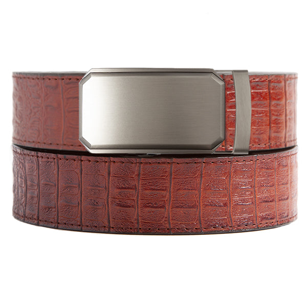 The Faux Cayenne Crocodile Belt Strap has a deep red/brown color with a rich texture.