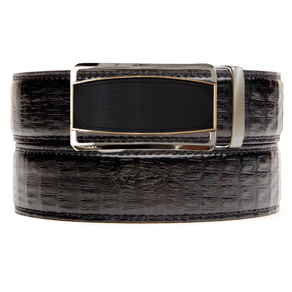 The Brighton Faux Black Crocodile Belt combo is a refined look for your wardrobe.