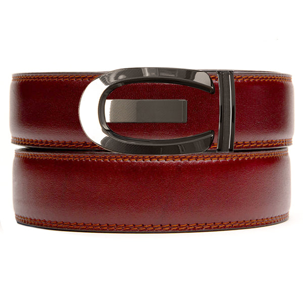 Our Coffee Belt is a reddish brown leather strap with stand out stitching.