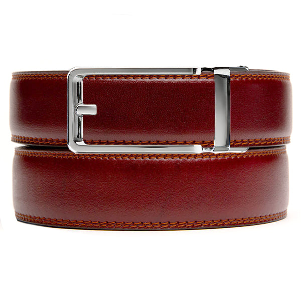 Our Coffee Belt is a reddish brown leather strap with stand out stitching.