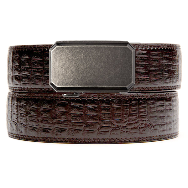 The Highland Faux Brown Crocodile Belt is the perfect combination of textured brown and gunmetal