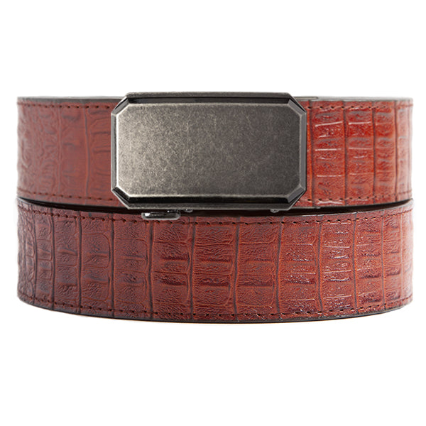 The Faux Cayenne Crocodile Belt Strap has a deep red/brown color with a rich texture.