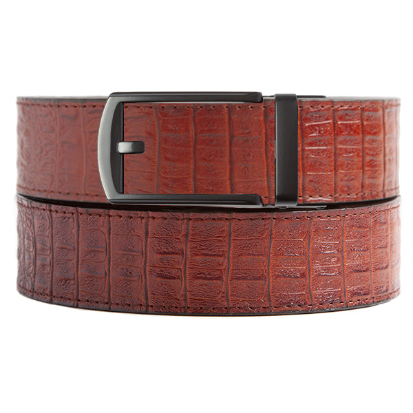 The Faux Cayenne Crocodile Belt Strap has a deep red/brown color with a rich texture.