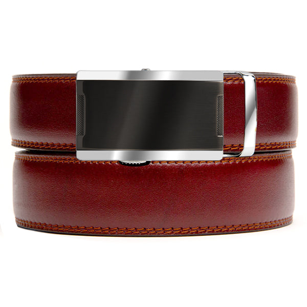 Our holeless Coffee Belt Strap is a rich brown/red color that pairs excellently with jeans.