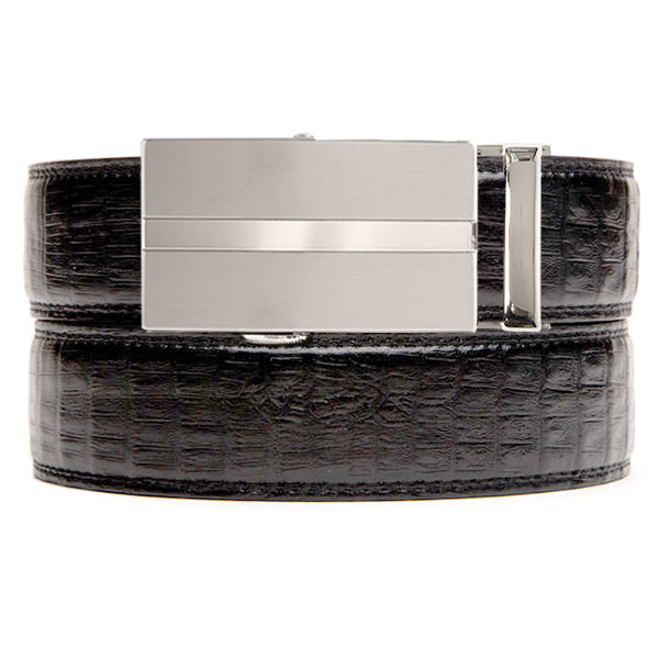 Our Black Faux Crocodile Belt Strap is a deep black with a light texture.