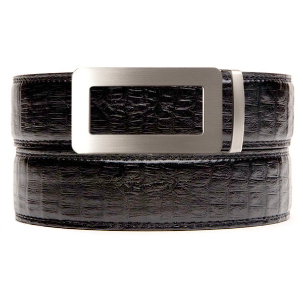 Our Black Faux Crocodile Belt Strap is a richly textured full grain leather in a deep black.