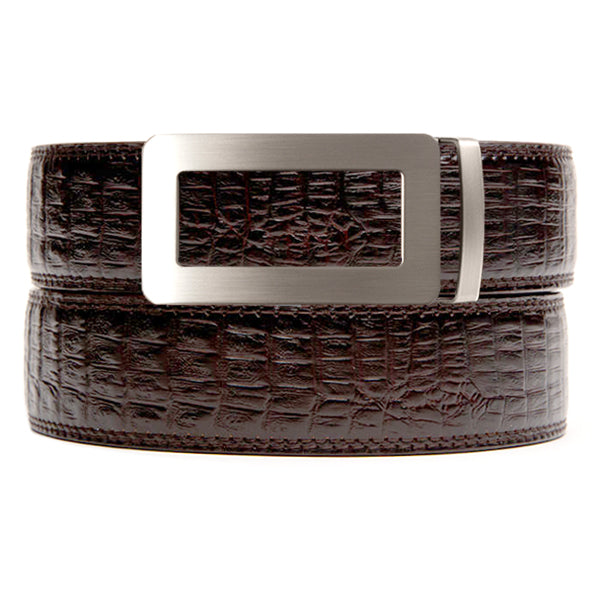 The Surrey Faux Brown Crocodile Belt is the perfect combination of textured brown and gunmetal.