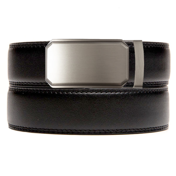 The Blackburn Buckle has a brushed gunmetal finish with beveled edges.