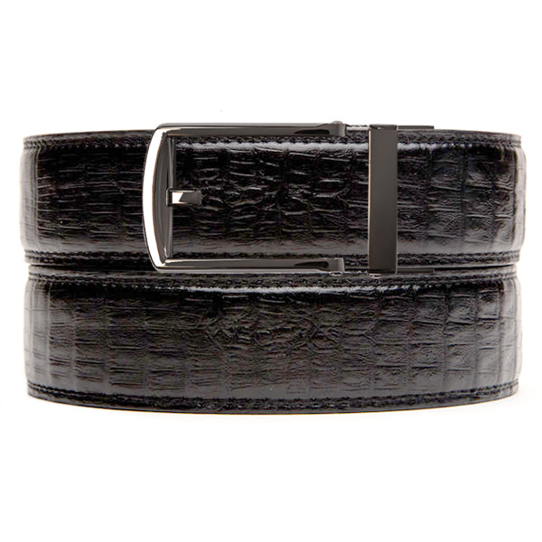 Our Black Faux Crocodile Belt Strap is a richly textured full grain leather in a deep black.