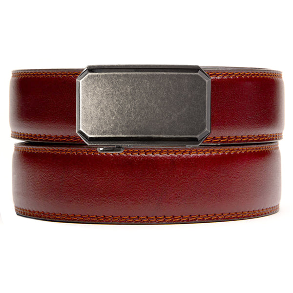 Our Coffee Belt is a reddish brown leather strap with stand out stitching.