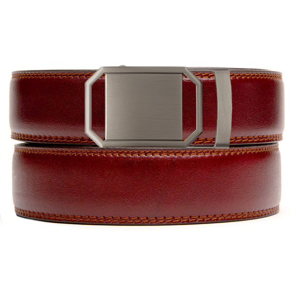 Our Coffee Belt is a reddish brown leather strap with stand out stitching.