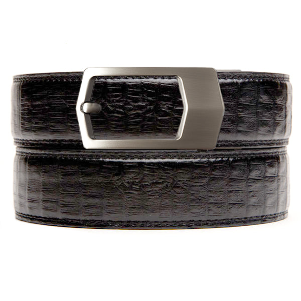 Our Black Faux Crocodile Belt Strap is a richly textured full grain leather in a deep black.